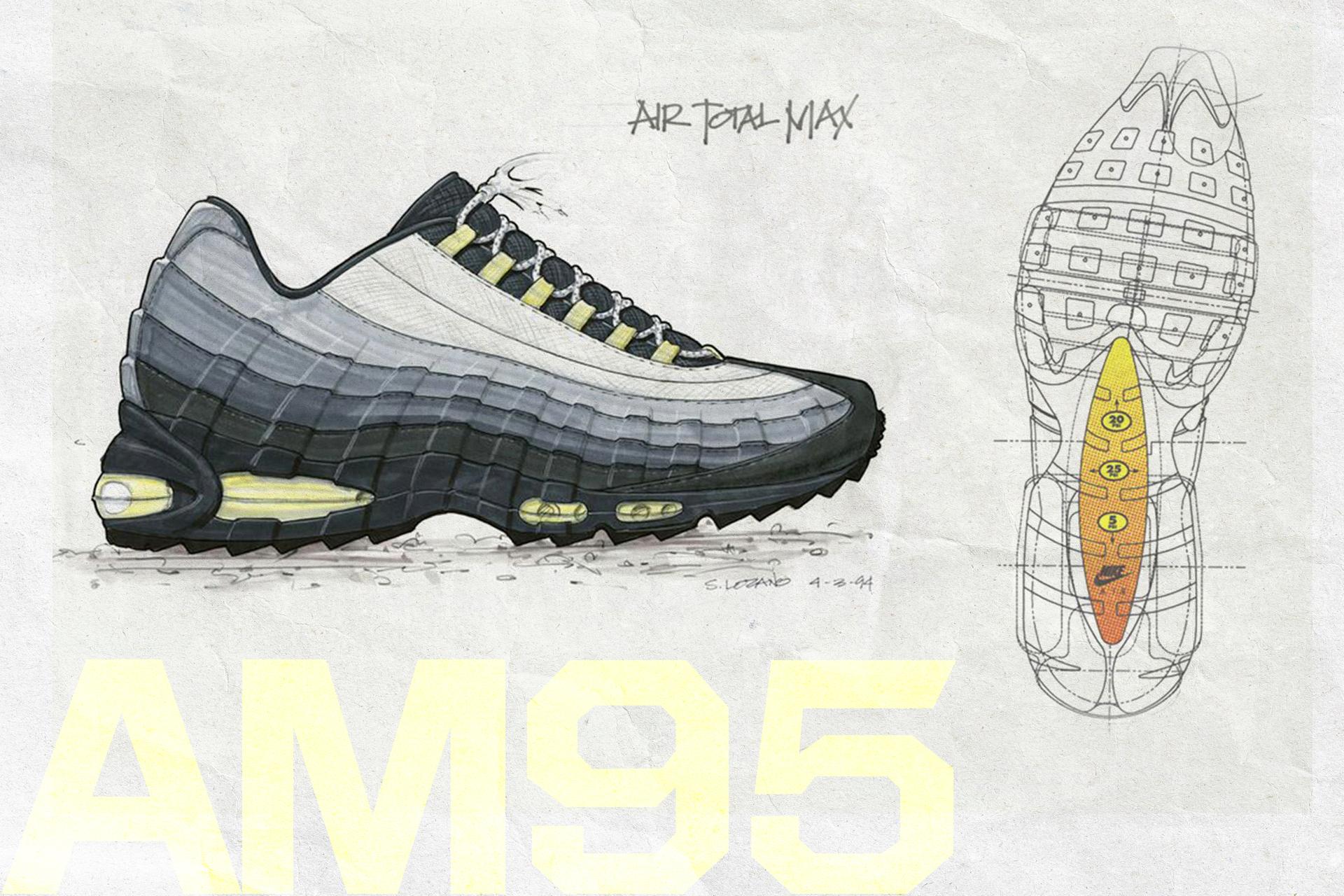 First launched in its signature Grey and Neon colourway, the stylish Air Max 95 earned praise for its look and comfort and was the first Air Max shoe to incorporate a visible forefoot Air bag. This new approach to cushioning brought runners increased comfort and support with dual Air units. The flex groove pattern and a higher, coloured midsole were also firsts for this Air Max. These traits drastically departed from traditional running shoe designs. The silhouette was designed by Sergio Lozano, a relatively new Nike designer, who took inspiration from the human anatomy and bone structure. The midsole represented the base of the spine, serving as the backbone of the design. Nylon eyelets represented the ribs, while the upper’s layered panels and mesh symbolised muscle fibres and flesh.