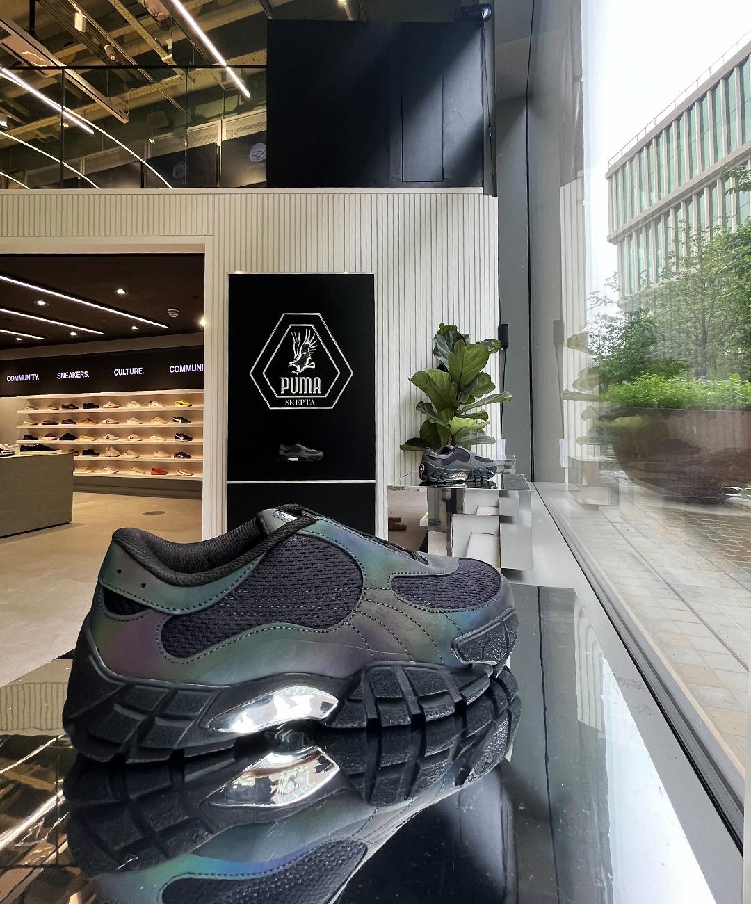 The all-new footwear style is inspired by the early 2000s footwear designs and debuts in a special iridescent colorway. Robust tooling serves as the foundation for the upper, featuring a mesh underlay wrapped in fluid opalescent panels. Silver accents emerge from beneath the Skope Forever, contrasting with its covert colourway. A special PUMA x Skepta badge features on the tongue, completing the tech-luxe silhouette.